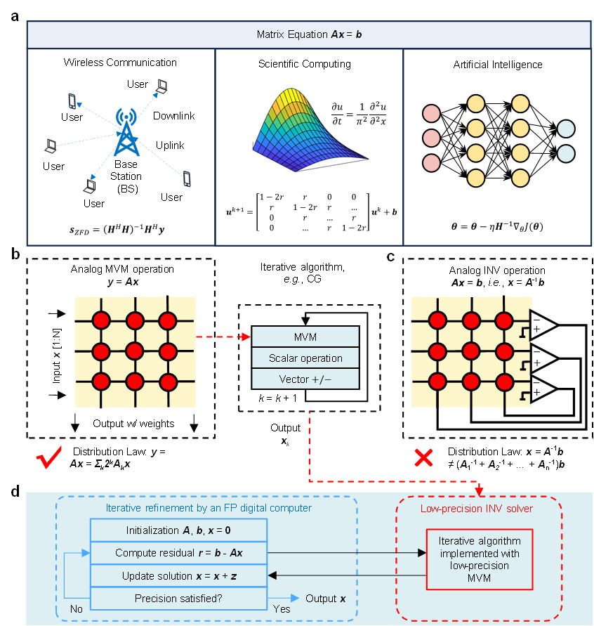 矩阵方程求解是线性代数的核心内容,在信号处理、科学计算及神经网络二阶训练等领域具有广泛应用。相较于常规矩阵乘法,矩阵求逆操作对输入误差的敏感性显著更高,因此对计算精度提出了严格要求。然而,采用数字方法实现高精度矩阵求逆的计算开销极大,其时间复杂度可达立方级。随着大数据驱动类应用的兴起,这种高复杂度计算给传统数字计算机带来了严峻挑战,尤其在传统器件尺寸缩放逼近物理极限、传统冯·诺依曼架构面临“内存墙”瓶颈的双重背景下,这一问题日益凸显。