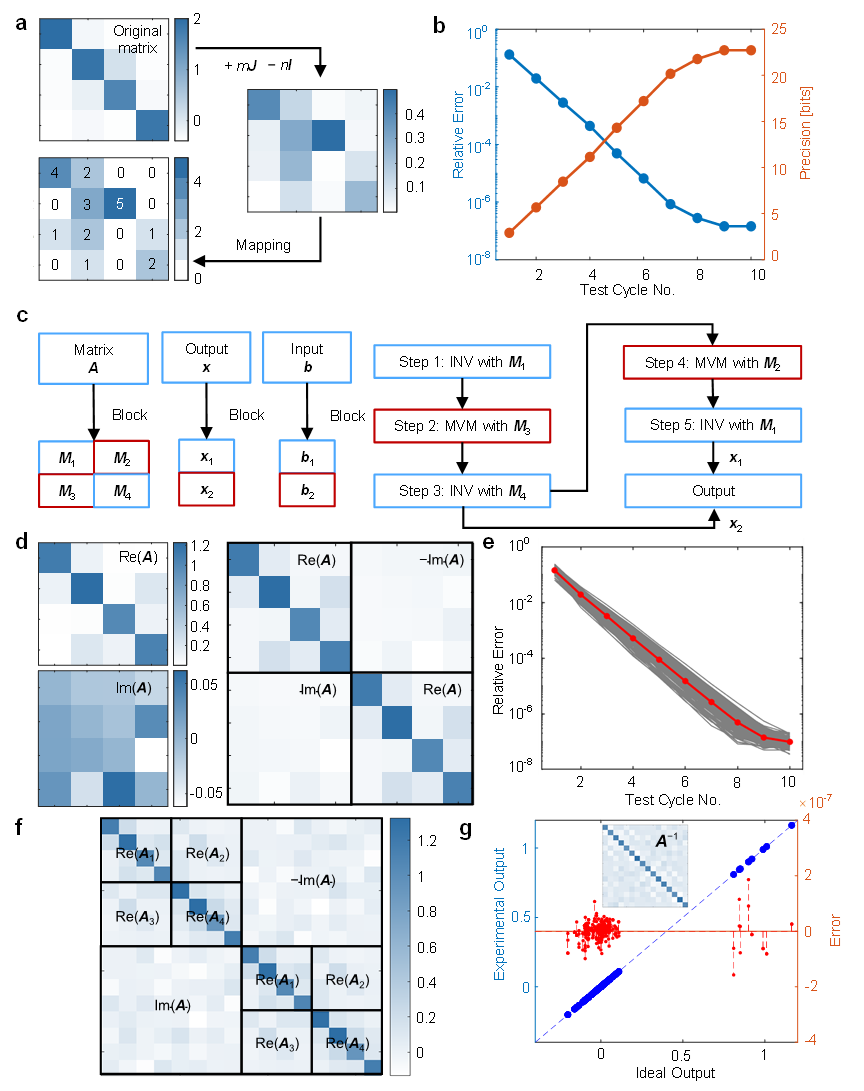 通过与块矩阵算法相结合,研究团队在实验上成功实现了16×16矩阵的24比特定点数精度求逆(图3)。具体而言,矩阵方程求解经过10次迭代后,相对误差可低至10⁻⁷量级,展现了该方案在计算精度上的显著优势。