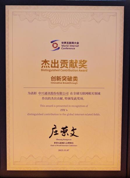 世界互联网大会设立世界互联网大会杰出贡献奖,表彰在全球互联网相关领域作出杰出贡献的个人和企业。中兴通讯通过持续高强度研发投入的技术策略和基于“底层创新+生态聚合”的原则,以自身科技创新实力加快培育新质生产力,躬身入局率先进行数智化升级,打造极致AI公司,以丰富实践经验携手产业伙伴助力全行业和全社会高质量发展,荣获该奖项。