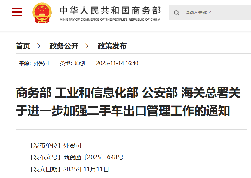 11月14日,商务部、工业和信息化部、公安部、海关总署联合发布《关于进一步加强二手车出口管理工作的通知》(以下简称《通知》)。为深入贯彻落实党中央、国务院决策部署,进一步规范汽车产业竞争秩序,四部门决定从严格出口管理、加强合规审查、推动健康发展三方面发力,促进我国二手车出口健康有序发展。