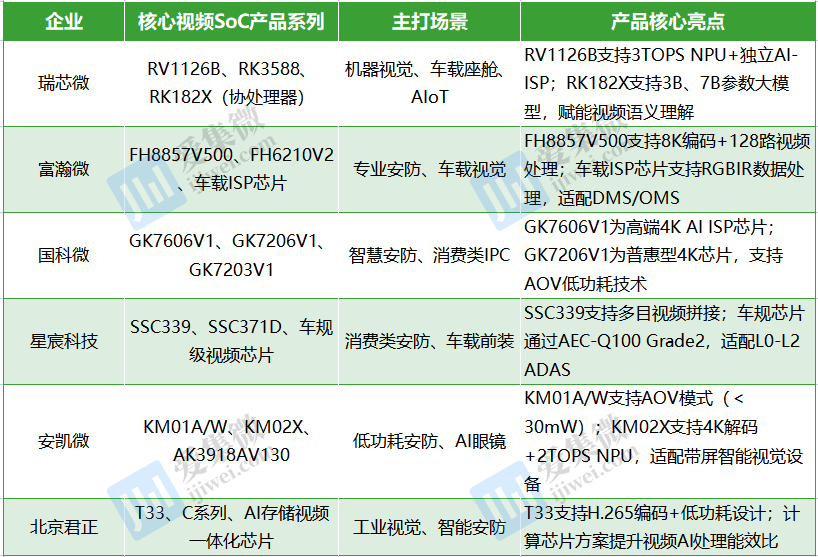 6家企业围绕视频SoC芯片的核心应用场景,形成“安防-车载-消费电子-工业”的全场景产品矩阵,产品定位差异化明显,且均以视频处理为核心功能。