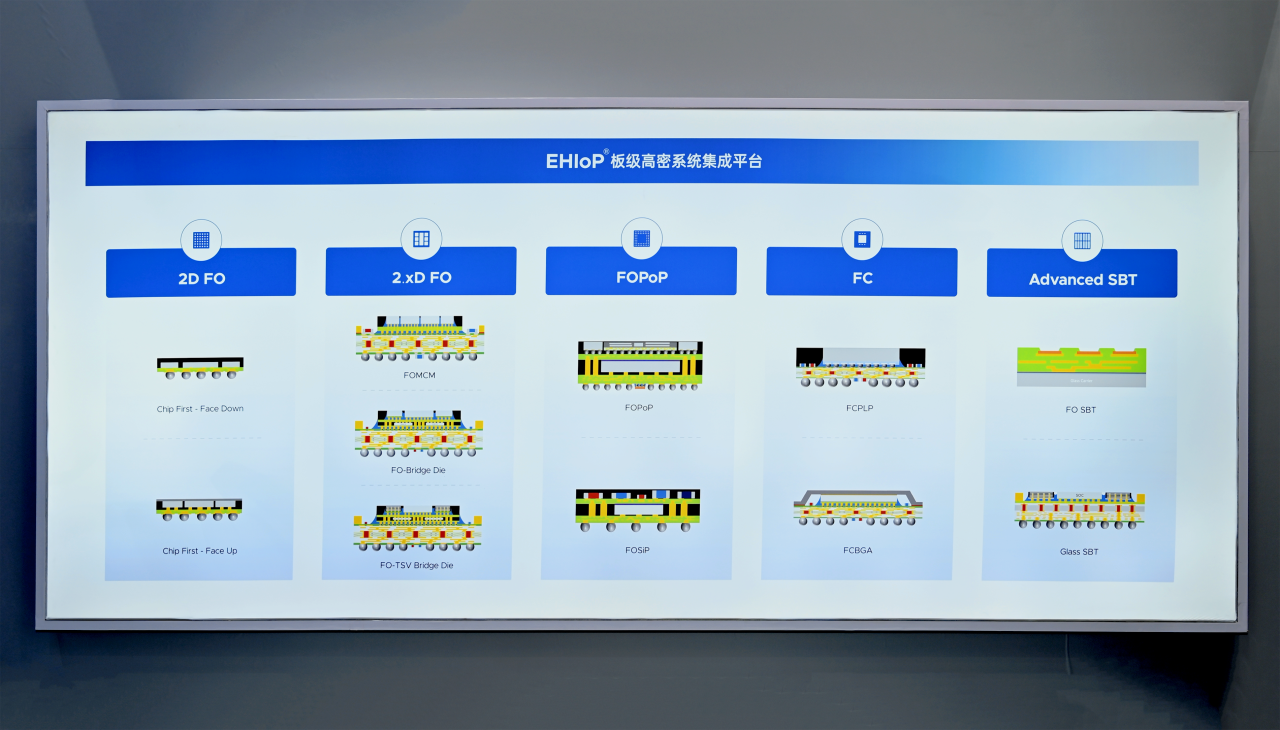 本次大会,奕成科技现场发布的全新技术矩阵——EHIoP® 板级高密技术平台,包含2D FO、2.xD FO、FOPoP、FC、Advanced SBT等多种先进封装技术,可覆盖小芯片/模组、中高端模组、高性能异构集成系统等多种类型的芯片产品,以满足算力需求激增对高端先进封装提出的全新挑战。