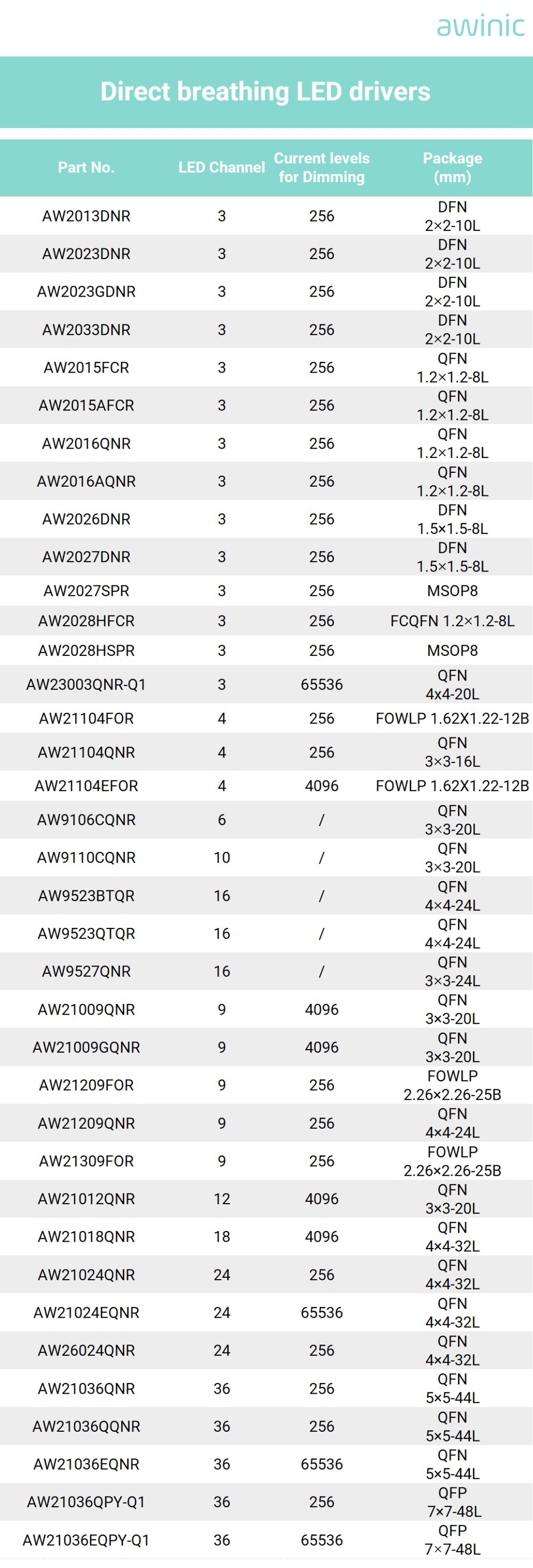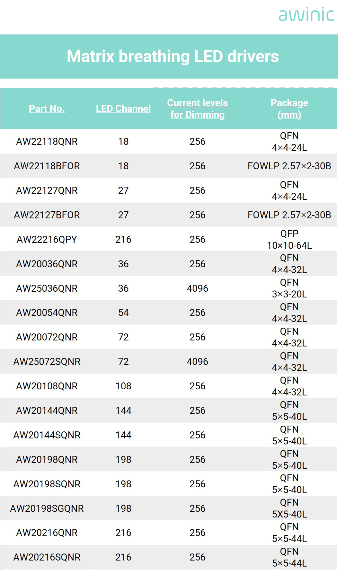 AW20216SQNR作为艾为灯语®系列的重磅产品,驱动多达216路LED(72颗RGB灯珠),支持1680万全彩混色和256级细腻亮度调节。采用高性能消鬼影、低EMI、啸叫抑制等技术, 同时支持10MHz高速SPI接口,为电竞外设打造高端灯效提供优异的解决方案。