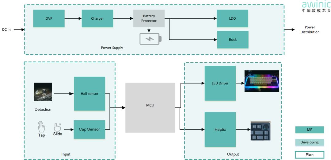 除呼吸灯驱动外,数模龙头艾为电子全新升级电竞键盘应用方案,覆盖电源管理、电容触控、触觉反馈等关键模块,助力产品实现快速响应与稳定输出,打造沉浸式的电竞体验。