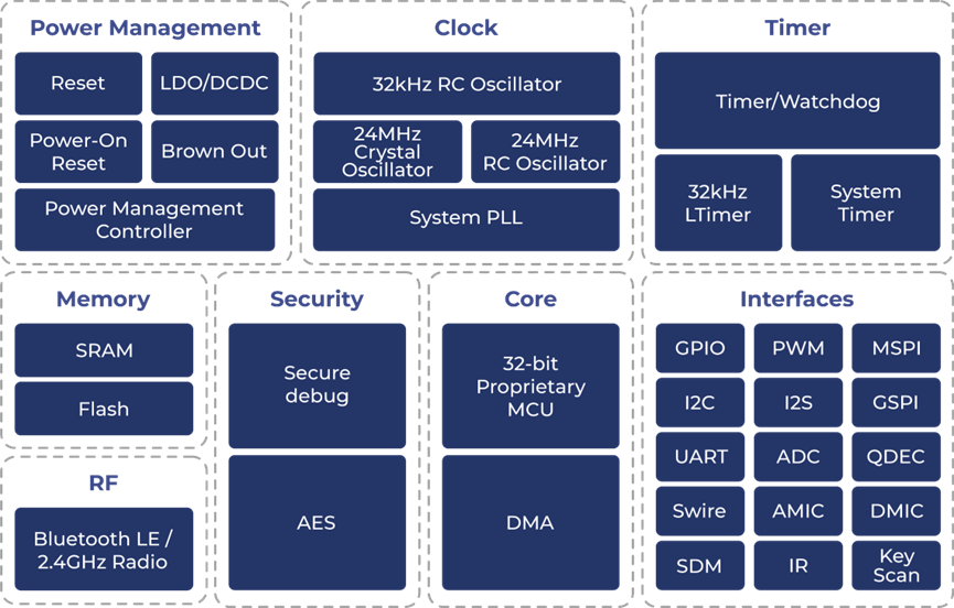 • 丰富外设:GPIO、UART、SPI、16-bit ADC、DMIC/AMIC、KeyScan等硬件接口拉满