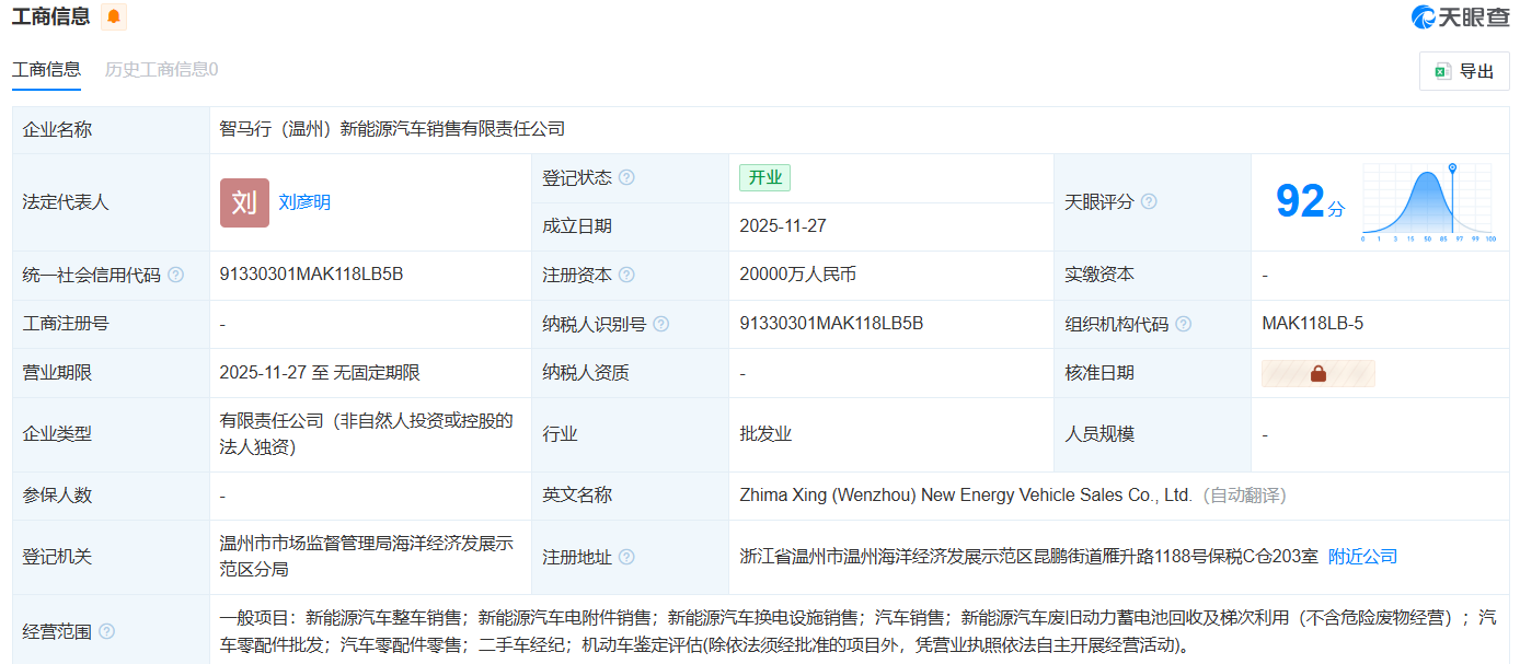 天眼查信息显示,智马行(温州)新能源汽车销售有限责任公司法定代表人为刘彦明,注册资本达2亿元人民币,经营范围涵盖新能源汽车整车销售、新能源汽车电附件销售、新能源汽车换电设施销售及汽车销售等多个核心领域,业务布局直指新能源汽车产业链终端服务环节。