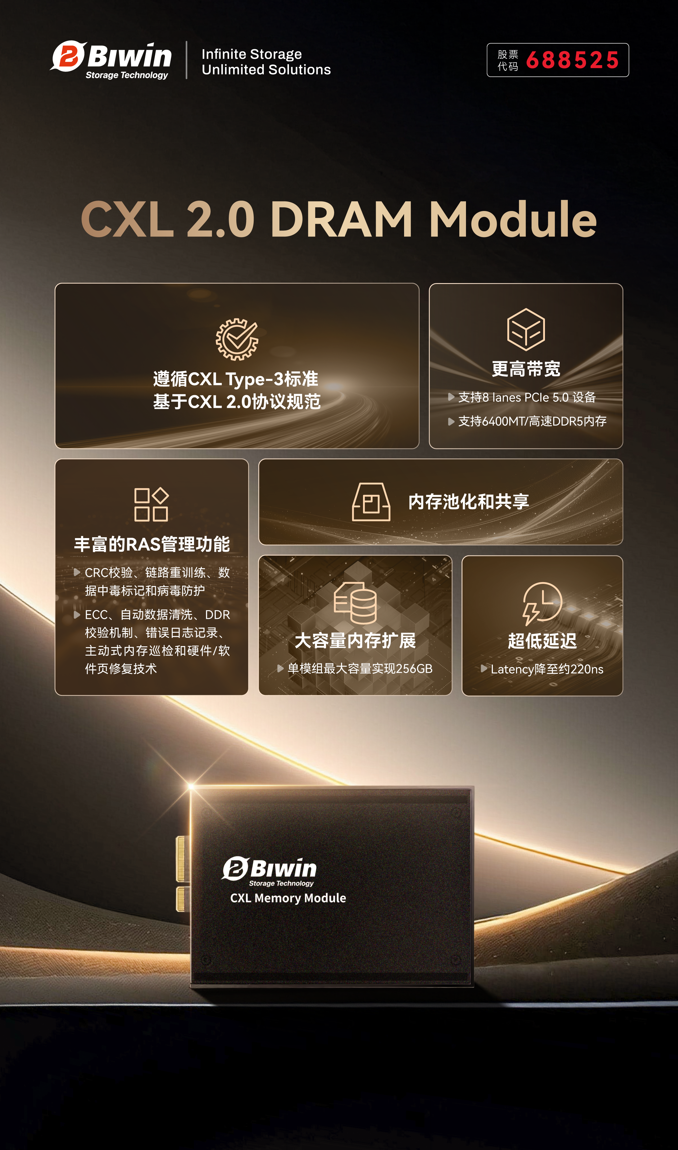 近日,佰维存储亮相由权威媒体DOIT举办的“2025中国数据存储峰会”,公司自主研发的CXL 2.0 DRAM Module产品,荣获2025存储风云榜“年度AI存储产品金奖”。