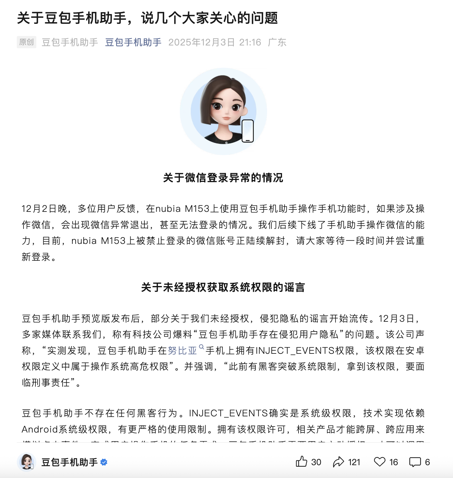 12月3日,豆包手机助手运营团队今晚发布公告,就微信登录异常等大家关心的问题进行了说明。