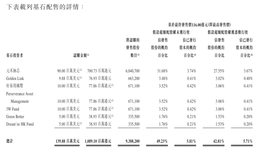 纳芯微此次IPO引入7名基石投资者,包括元禾纳芯、比亚迪(01211)全资附属Golden Link、好易得国际、Perseverance Asset Management、3W Fund、小米(01810)全资附属Green Better、Dream'ee HK Fund,认购金额10.9亿港元。