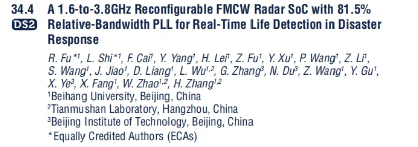 张慧教授、伍连博副教授团队发表的论文名为《A 1.6-to-3.8GHz Reconfigurable FMCW Radar Soc with 81.5% Relative-Bandwidth PLL for Real-Time Life Detection in Disaster Response》,具备1.6GHz至3.8GHz宽频自适应可调节能力,搭载高带宽锁相环,可实现穿透多种障碍物下的多目标运动轨迹跟踪与呼吸体征检测功能。这项技术首次在ISSCC上亮相,未来可在灾后救援、医疗监护、反恐行动等领域发挥重要作用,为复杂环境下的生命探测提供高精度、实时化的芯片级解决方案。论文被安排在Session 34进行报告,并将在Demo Session中进行实物展示,欢迎学界与业界同仁现场交流。