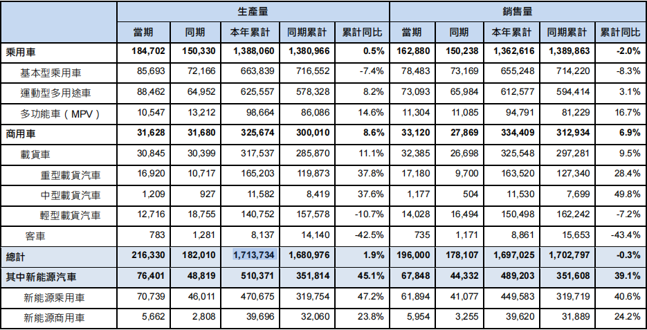 细分车型来看,乘用车领域:基本型乘用车累计产量663,839辆,同比下降7.4%,累计销量655,248辆,同比下降8.3%;运动型多用途车(SUV)累计产量625,557辆,同比增长8.2%,累计销量612,577辆,同比增长3.1%;多功能车(MPV)累计产量98,664辆,同比增长14.6%,累计销量94,791辆,同比增长16.7%。