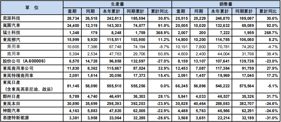 合资品牌中,东风日产(含东风英菲尼迪、启辰)累计产量555,510辆,同比持平,累计销量546,222辆,同比下降5.1%;郑州日产累计产销量分别为46,491辆、46,537辆,同比增长28.1%、31.7%;东风本田累计产销量分别为298,393辆、288,583辆,同比下降23.9%、24.6%;神龙汽车累计产销量分别为47,820辆、46,966辆,同比下降22.9%、24.6%;易捷特新能源累计产销量分别为23,064辆、22,214辆,同比下降28.6%、31%。