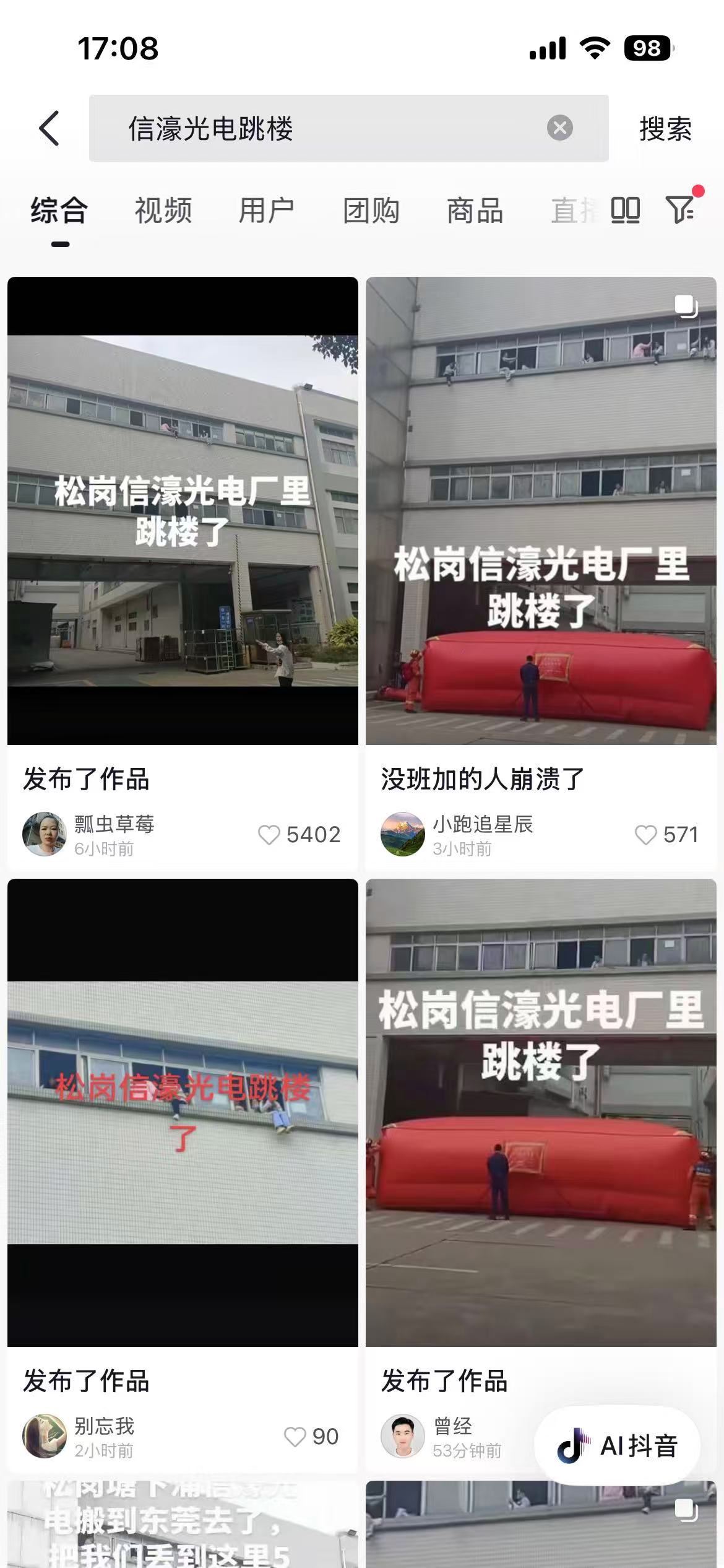 12月10日,抖音平台信息显示,深圳松岗信濠光电厂区发生人员跳楼事件。