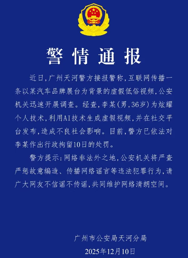 12月10日,广州市公安局天河分局发布警情通报称,近期接到报警,称互联网上传播一条以某汽车品牌展台为背景的虚假低俗视频,引发不良社会影响。接到报警后,公安机关迅速启动调查程序,全力核查视频来源及相关责任人。