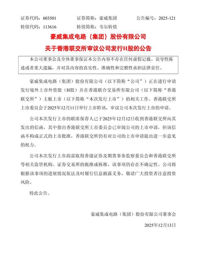 12 月 12 日,豪威集团公告,公司正在进行申请发行境外上市外资股(H 股)并在香港联交所主板上市的相关工作。香港联交所上市委员会于 2025 年 12 月 11 日举行上市聆讯,审议公司本次发行上市的申请。