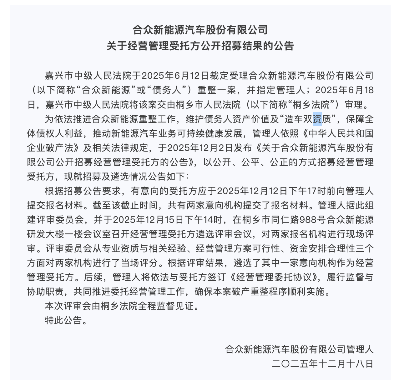 哪吒汽车母公司合众新能源发布关于经营管理受托方公开招募结果的公告。公告提到,共有两家意向机构提交了报名材料。评审委员会从专业资质与相关经验、经营管理方案可行性、资金安排合理性三个方面对两家机构进行了当场评分。根据评审结果,遴选了其中一家意向机构作为经营管理受托方。后续,管理人将依法与受托方签订《经营管理委托协议》,履行监督与协助职责,共同推进委托经营管理工作,确保本案破产重整程序顺利实施。