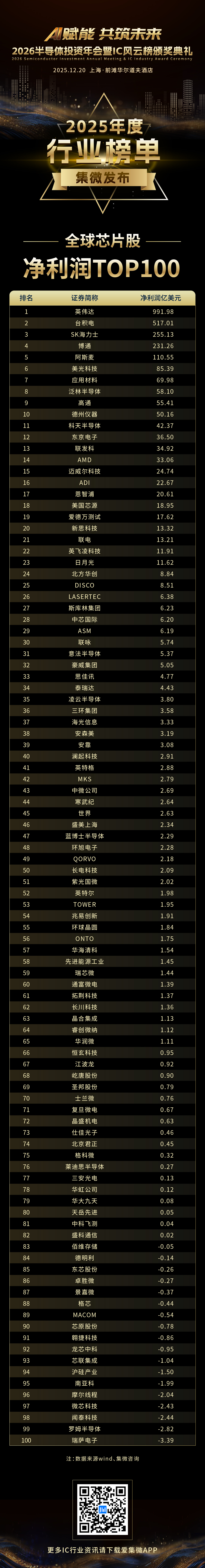 此为“全球芯片股”系列榜单之《全球芯片股——净利润(TTM)TOP100》。