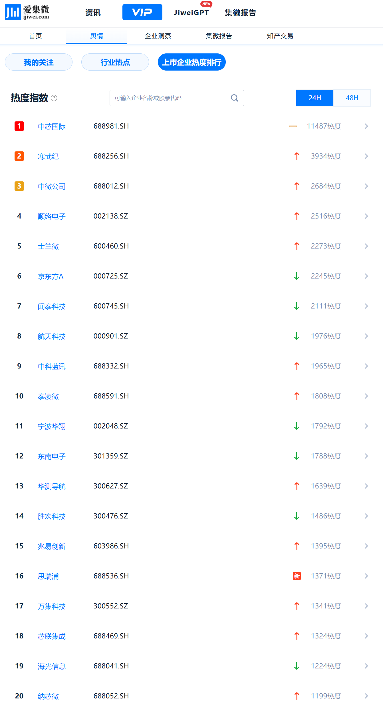 登录爱集微VIP频道,实时查看动态“上市企业热度排行”,穿透洞察每一个波动背后的驱动因素。