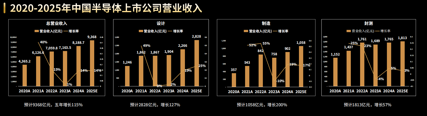 财务表现是衡量产业健康度的核心指标。报告数据显示,过去五年,尽管经历了行业下行周期的考验,但过去五年整个半导体行业总体依然保持良好增速,预计2025年总营业收入将达到9368亿元,同比增长14%,近五年总增长111%。