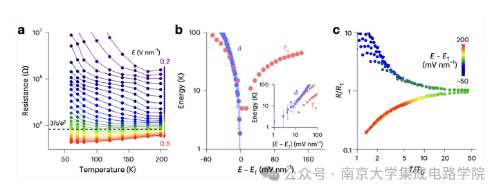 图3. 无序驱动的金属绝缘体相变及量子临界标度行为。a,不同电场下的面电阻随温度变化关系。b,当电场E趋近临界场ET时,激活能隙Δ和温度标度参数T0。c,金属绝缘体相变附近的电阻随温度变化曲线。