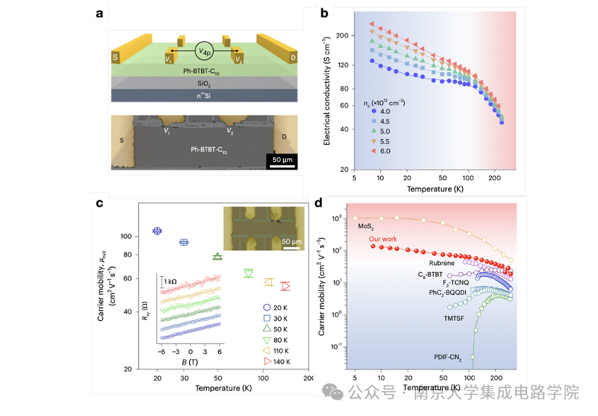 图2. 超宽温区金属型电荷输运。a,四探针结构的器件示意图及对应的光学显微镜图像。b,不同载流子浓度下,电导率随温度的变化关系。c,霍尔迁移率随温度的变化关系。d,高迁移率有机单晶半导体统计。