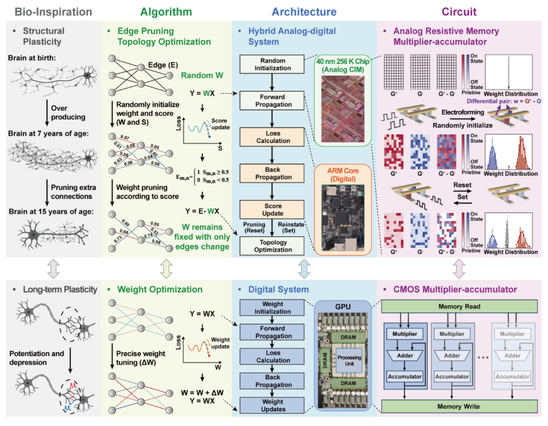 图1:基于边剪枝的软硬件协同模拟计算总体框架(图示生物启发机制、算法原理、系统架构与电路实现的对比整合)
