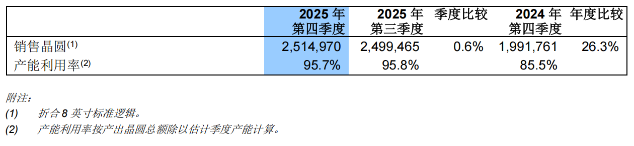 按晶圆尺寸分类,第四季度12英寸晶圆营收占比为77.2%,8英寸晶圆营收占比为22.8%。从产能方面来看,中芯国际月产能由2025年第三季度的102.275万片折合8英寸标准逻辑增加至2025年第四季度的105.875万片折合8英寸标准逻辑。第四季度销售晶圆达251.4万片折合8英寸标准逻辑,产能利用率与Q3基本持平为95.7%。