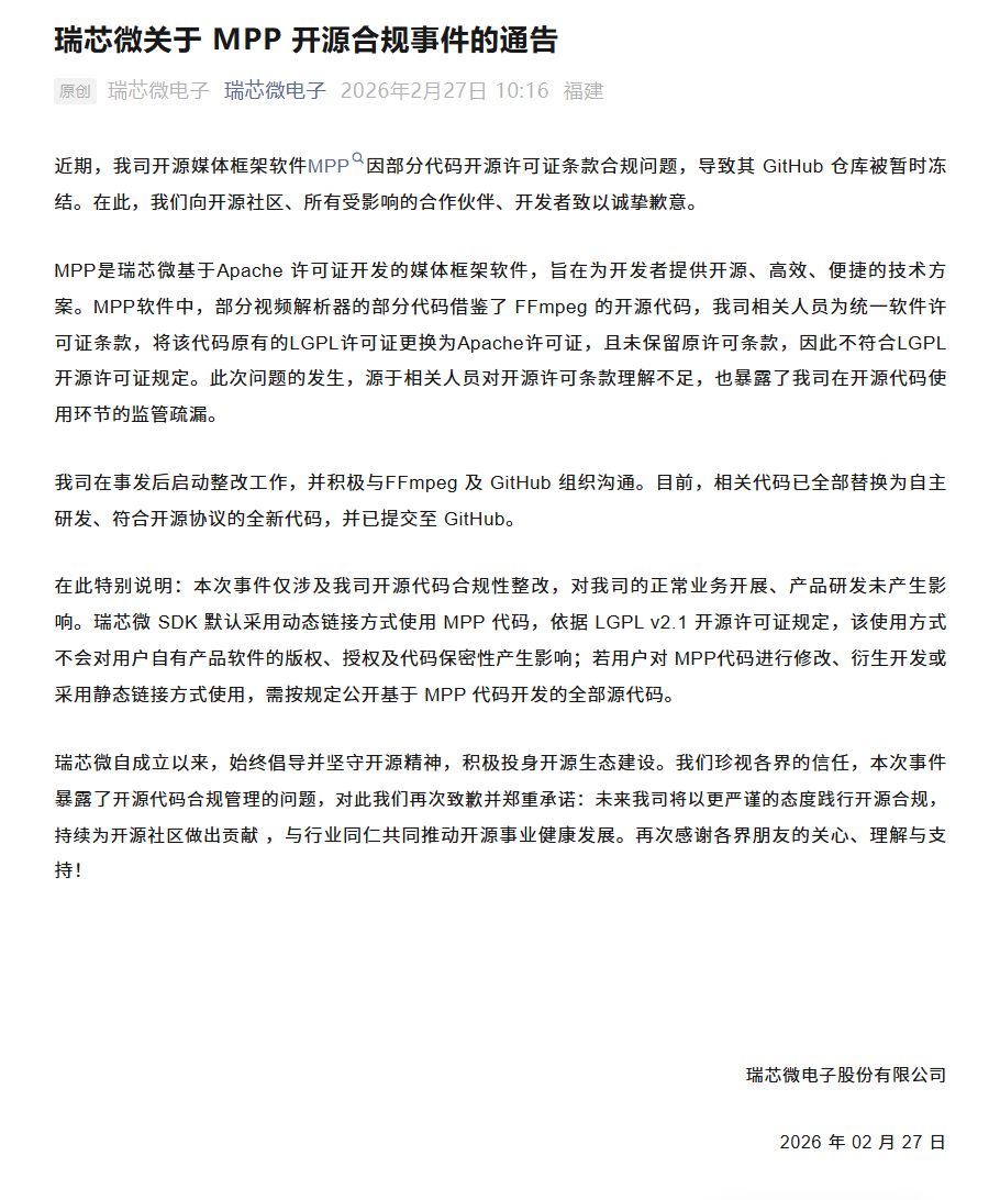 2月27日,瑞芯微发布官方通告,就公司开源媒体框架软件MPP因许可证条款合规问题导致GitHub仓库被暂时冻结一事,向开源社区、合作伙伴及开发者致以诚挚歉意,并披露了问题成因与整改结果,明确此次事件未对公司正常经营产生影响。