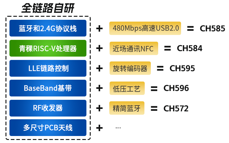 基于自研的2.4GHz通信、RISC-V处理器和协议栈技术,沁恒提供系列化的低功耗无线SoC/MCU芯片。部分典型产品例如自带480Mbps高速USB2.0 PHY+高性能2.4G+蓝牙5.4+NFC的CH585、内置旋转编码器接口的CH595等,上述芯片均内置ADC,提供段式LCD驱动、LED点阵屏接口、防水级触摸按键等功能。