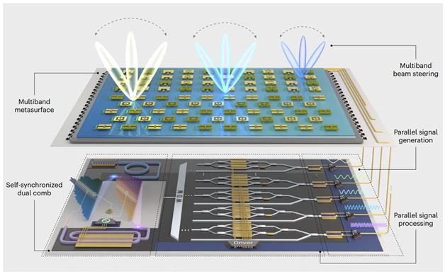 为攻克这些难题,研究团队研发了一种全新的光电子集成驱动大规模超表面方案,改变了传统的无线终端设计思路。该平台利用自同步双梳技术,无需离散的电子振荡器,即可同时生成超过60个高达100GHz的、可灵活重构的微波频率。基于这项技术,团队提出了基于集成光学与超表面的多频段并行发射机。为了完成信号的空间调控,团队引入了低功耗、紧凑型的超表面来进行多频段波束赋形。与传统相控阵相比,超表面的设计更加紧凑,具有灵活的波束调控能力,且能将功耗大幅降低40%以上。该架构打破了常规瓶颈,成功实现了极具挑战性的1024-QAM高阶通信调制传输,这一成果达到了光子学辅助无线链路领域的先进水平。更具突破性的是,该架构极大缩短了射频前端的信号路径,首次实现了利用数据中心的标准硅基光电子收发器直接驱动无线边缘设备,将数据中心处理与无线网络实现了无缝、高能效和低延迟的连接。在实验验证环节,系统不仅实现了全固态毫米波频段的点云雷达成像,也成功传输了高清视频帧,展现出了优异的性能与多功能一体化能力。