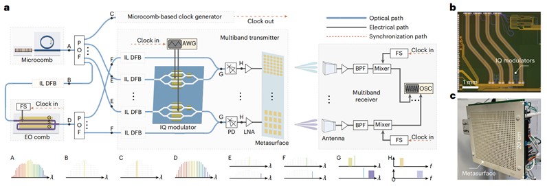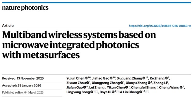 2026年3月4日,北京大学电子学院常林研究员团队与宋令阳教授、邸博雅研究员团队合作在顶级学术期刊《自然·光子学》(Nature Photonics)在线发表了题为“Multiband wireless systems based on microwave integrated photonics with metasurfaces”的研究文章。该团队在世界上首次提出了一种可扩展的统一平台,通过将光子集成电路与电磁超表面相结合,成功实现了支持从2G到6G及以上不同频段移动系统的并行无线通信架构。这一突破不仅打破了多频段硬件集成的壁垒,还为未来大规模无线系统的降本增效提供了基础性方案。