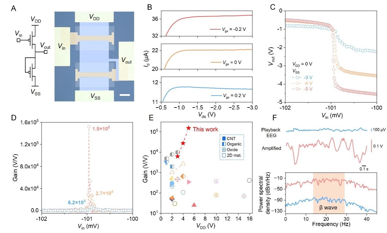 研究系统探究了接触金属功函数、栅极结构及器件尺寸等关键参数对负微分电阻调制行为的影响,并深入揭示了其内在物理机制。在此基础上,利用NDR的可调性,团队成功在柔性碳纳米管放大器中实现了创纪录的1.5×105(约104 dB)增益,性能表现优于所有已报道的柔性电压放大器,并成功演示了对脑电回放信号的有效放大。这一成果为全柔性平台上的原位生理信号放大奠定了坚实技术基础,在高保真、长期稳定生理监测领域展现出巨大的应用潜力。