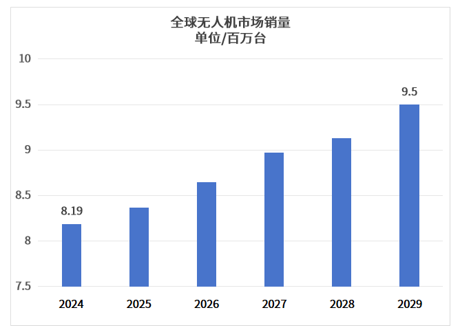 就市场销量及收入而言,2024年,全球无人机市场销量将达819万台,收入将达43亿美元,预计到2029年,全球无人机市场销量将达到950万台。