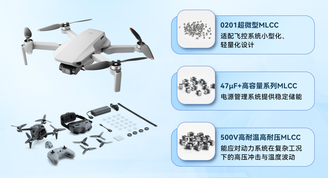 针对无人机领域对MLCC性能的严苛要求,微容科技推出了全系列高端MLCC解决方案:
