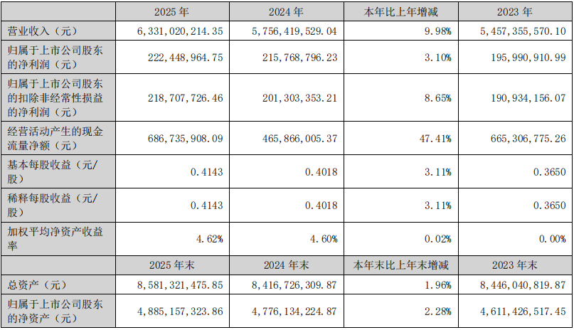 截至2025年末,公司总资产为85.81亿元,较上年末增长1.96%;归属于上市公司股东的净资产为48.85亿元,较上年末增长2.28%。资产负债率为36.24%,与上年末基本持平。