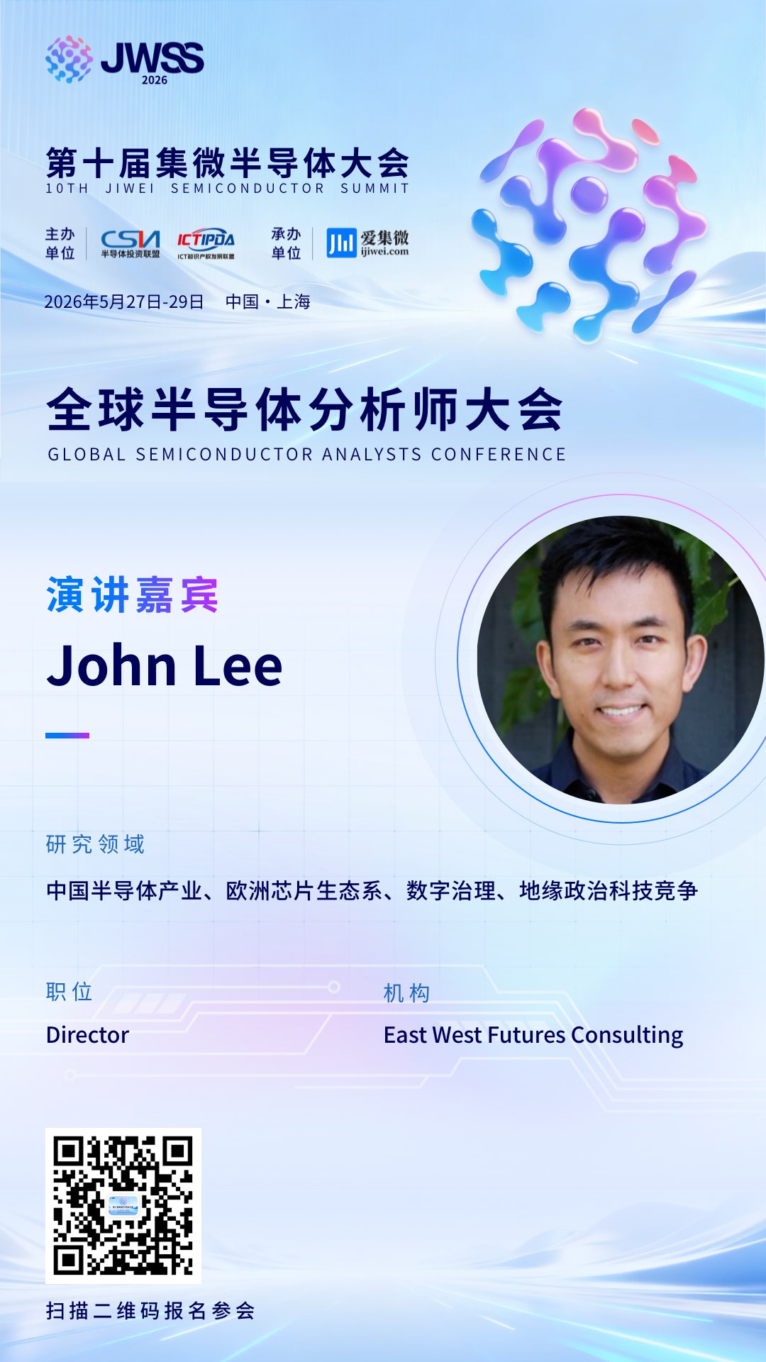 这是一次深入理解欧洲半导体战略的思想碰撞,一次与中欧关系专家面对面交流的难得契机。5月27-28日,上海张江,让我们共同聆听John Lee带来的欧洲视角与地缘洞察,在全球芯片格局重塑的浪潮中,精准把握欧洲市场的新动向!